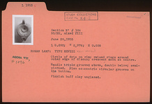 | Description: | Circle of dots on rim; raised rings around outer edge of discus; crescent moon at center. Handle triple grooved above, double below; semi-pierced. Five concentric circular grooves on the bottom. Unglazed. Pinkish-buff clay. Type XXVII variant of Corinth collection. | |