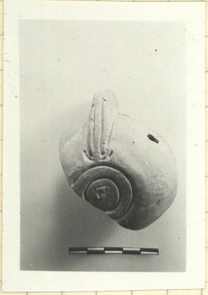 | Description: | Base, handle, part of rim and edge of disk preserved. Double grooved handle unpierced, hatched in center. Rim grooved, two small circles on each side of handle; rosette on discus. On base inside of two concentric circles:"K". Purple-red to gray clay; purplish surface. Type XXVIII of Corinth collection. <graphic> | |