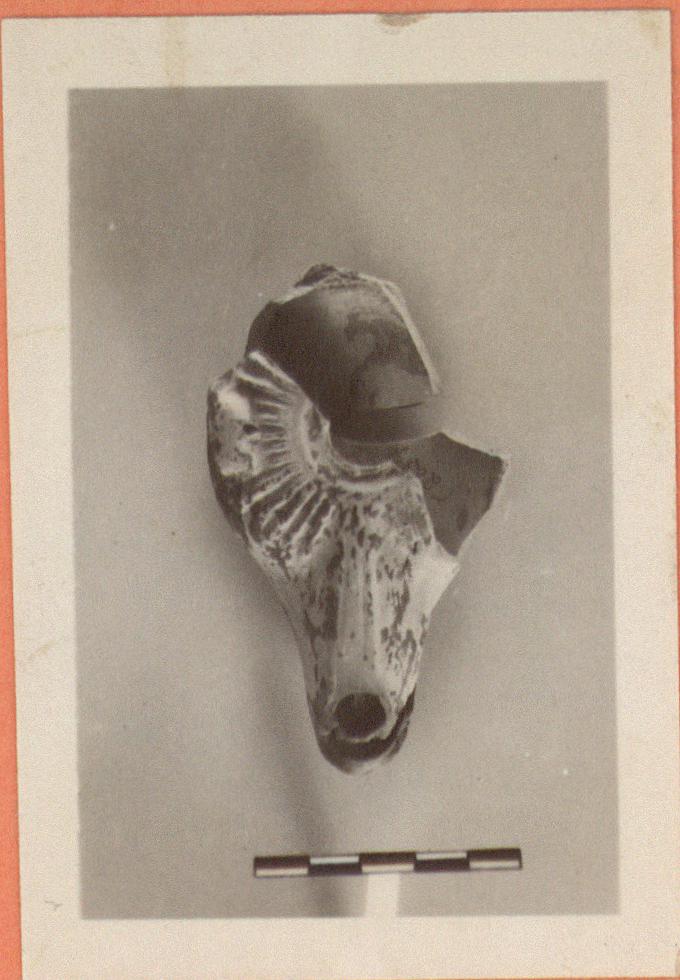 | Description: | Most of body including vertical strap handle, and end of nozzle missing. Upper body ribbed. Pierced cornucopia-shaped lug. Red glaze much peeled. Type XVIII of Corinth collection, type 48Β of Agora collection. ADDENDA Restored in plaster since photographing. | |