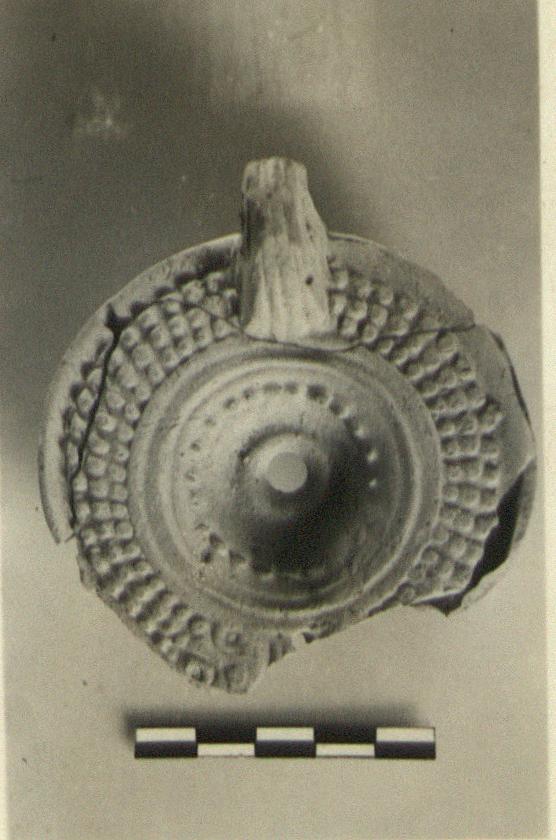 | Description: | Nozzle, most of front part, and most of the base missing. Rows of raised dots on rim and on lower body; a ring of dots also around the discus. Volutes at base of nozzle. Triple grooved handle, carelessly pierced through. Concentric ridges on the bottom. Unglazed. Pale buff clay. Type XXVIII of Corinth collection. | |