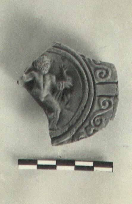 | Description: | Part of disk and rim. The disk separated from rim by three grooves, has a relief of bearded nude figure striding right, with a chlamys hanging over his left arm. Above the left hand is an attribute, a fish (?). Same pattern as L 379. No glaze. Yellow-buff clay. Type XXVIII of Corinth collection. Cf. Corinth IV, ii, figs. 18, 48: for rim pattern. | |