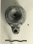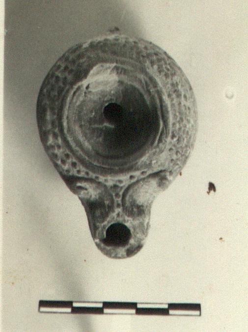 Deep sunk discus set off by raised bands; body decorated with raised dots; scrolls at nozzle.