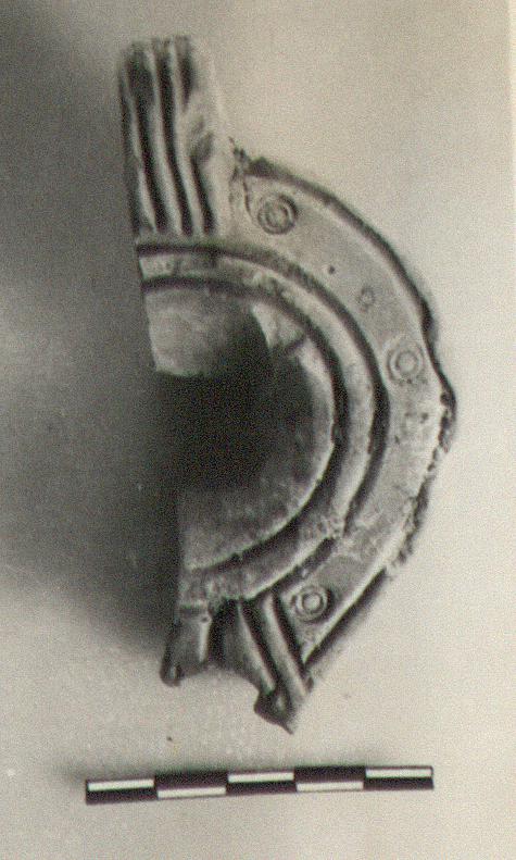 | Description: | Upper left part preserved. Rim bordered with grooves, within which three stamped circles, on each side. Plain discus, filling hole in center. Vertical grooved handle, unpierced. Air hole at base of neck. Thin red wash. Light red clay. Type XXVIII of Corinth collection. | |