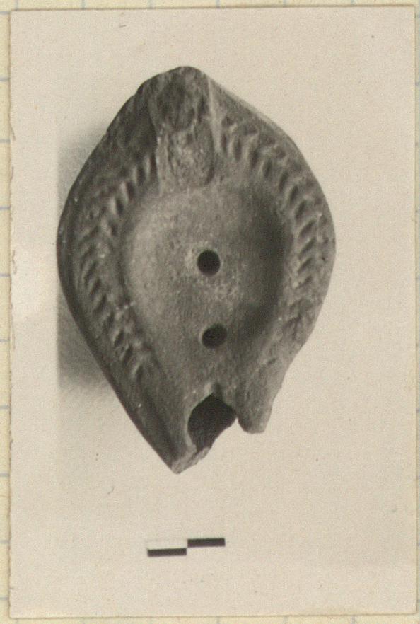 | Description: | Handle and nozzle broken. On rim, herringbone. Plain, pear-shaped discus, with two oil holes. On reverse, double almond-shaped groove with traces of palm branch. Unglazed. Pinkish clay. Type XXVIII of Corinth collection. | |