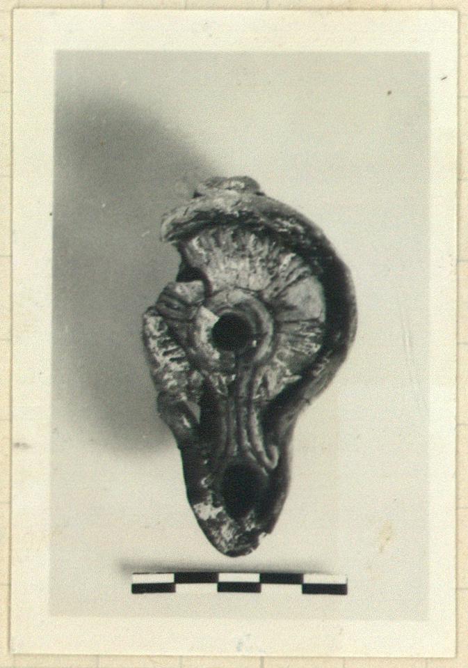 | Description: | Broken, burned, and chipped; the handle and most of the left side missing. A raised edge around a ribbed top; two ridges around filling hole continuing along top of nozzle. Simulated ring foot. Remains of black glaze. Gray clay. Type XVIII (post Sullan) of Corinth collection. ADDENDA Compare an example in the Benaki Collection, Alexandria (photo in Agora volume). | |