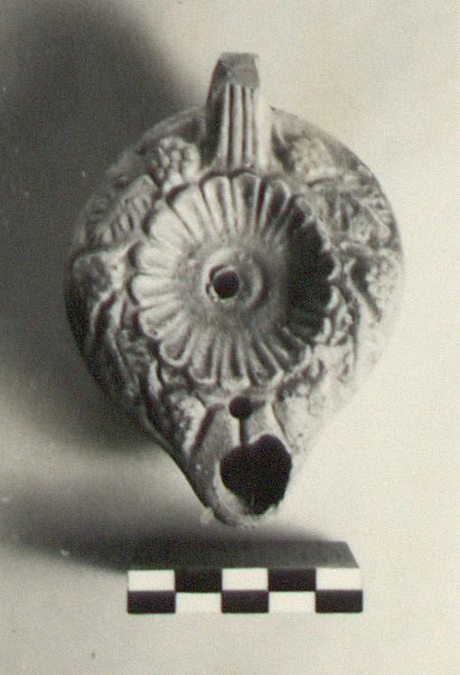 | Description: | Small part of handle missing. Vine pattern on rim; rosette on discus; air hole between rim and discus. Grooved unpierced vertical handle, on either side of the base of which a stamped semi-circle. Double concentric grooves on base, within which five stamped circles, very faint. Thin purplish-red glaze wash. Light red clay. Type XXVIII of Corinth collection. | |