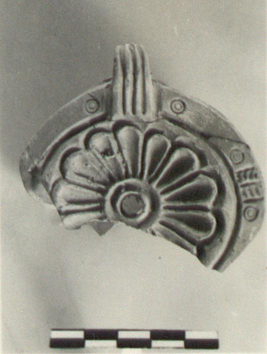 | Description: | Nozzle and front missing. Plain rim with herringbone panels and stamped circles. Rosette on discus; grooved, unpierced handle. Double circular grooves on bottom. Thin red glaze. Red clay. Type XXVIII of Corinth collection. | |