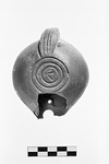 Grooved handle, solid; air hole at base of neck. Bottom has triple concentric grooves, within which a signature "Δ", surmounted by a dot.