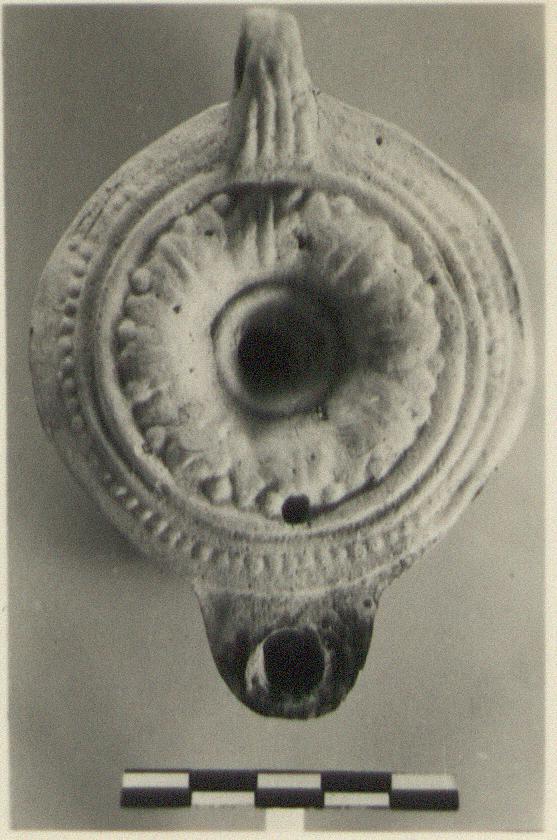 | Description: | Intact. On discus, leaf pattern. On rim, raised dots and lines. Handle, grooved above and partly below; pierced. On reverse, raised concentric lines and a dot. Pale slip. Yellowish-buff clay. Type XXVII variant of Corinth collection. | |