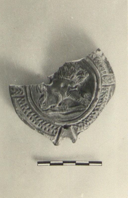 | Description: | Part of discus only preserved. Lion, right. Herringbone and panels on rim. Chocolate-brown glaze. Type XXVIII of Corinth collection. | |