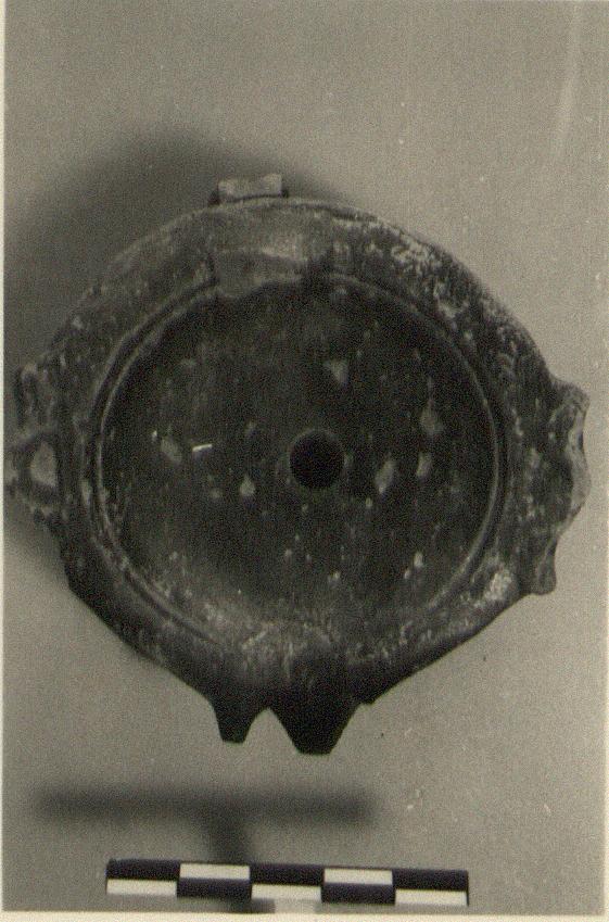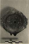 | Description: | End of nozzle, vertical loop handle, and chip from left side missing. Horizontal lugs at sides. Plain concave discus. In relief underneath letter "A". Black glaze, purplish. Type XXIV of Corinth collection. | |