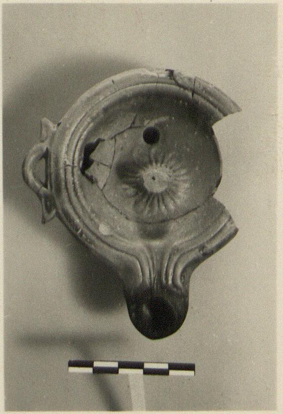 | Description: | Mended from many pieces; a large piece of right side missing, and the top of the handle. Narrow rim, grooved; large deeply concave discus, with one filling hole and a ribbed projection, for a suspension handle, in the center. Small horizontal ribbon handle at the side. Underneath, three small flat volute-like feet, one missing. Dull red glaze. Fine light red to buff clay. Type XXIV of Corinth collection. | |