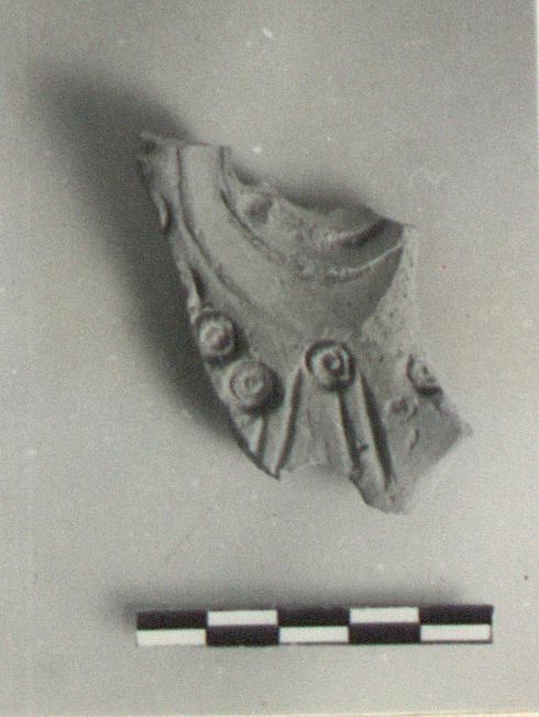 | Description: | Part of top preserved. Rim has very large stamped circles; another circle stamped for air hole at base of nozzle, but not pierced. Discus has concentric fasciae; filling hole at left of center. Unglazed. Pinkish-buff clay. Type XXVIII of Corinth collection. | |