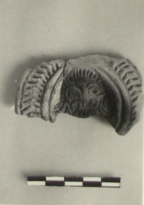 | Description: | Part of top preserved. Herringbone pattern on rim. Discus not a true circle; on it, a crudely modelled satyr mask, with prominent hair and whiskers. Thin red glaze (?); burned. Light red clay. Type XXVIII of Corinth collection. | |