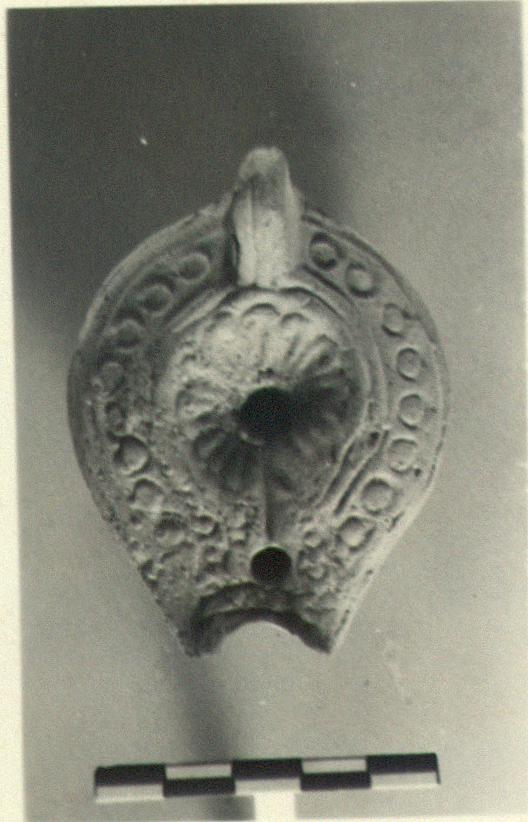 | Description: | Tip of nozzle broken away. On discus, rosette; on rim, rows of punched circles. Handle, solid, two grooves. On reverse, palm, branch. Unglazed. Red coarse clay. Type XXVIII of Corinth collection. | |