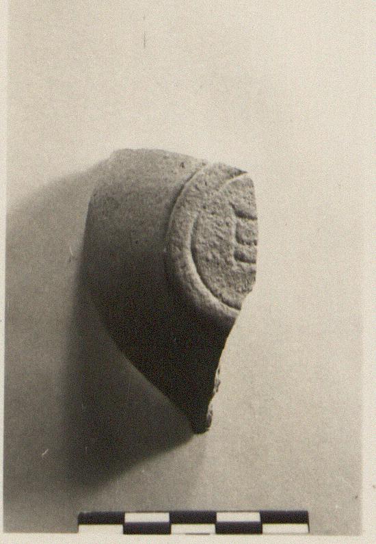 | Description: | Part of bottom and side preserved. On bottom, within double circular groove, part of the signature: "E". Unglazed. Greenish-yellow clay. Type XXVIII of Corinth collection. | |