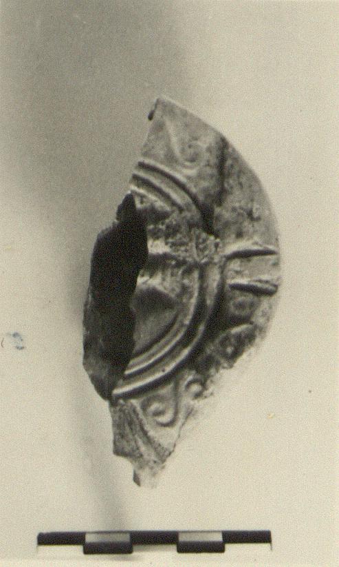 | Description: | The right half preserved. Handle and nozzle missing. On discus, fish (tail only). On rim, S-spirals. On reverse, within concentric grooves, "P". Unglazed; burnt. Grayish to buff clay. Type XXVIII of Corinth collection. <graphic> | |