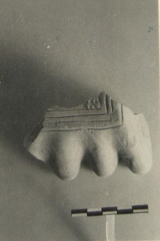 | Description: | Part of a rectangular lamp with a row of nozzles across one side. Three, and the start of a fourth preserved. Underneath, rectangular grooves and a rosette (?) in relief. Unglazed. Buff clay. | |