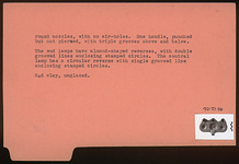 | Description: | Intact. Three lamps, the outer ones alike with herringbone patterns on rim; plain discus with filling hole and three other holes, each. The central lamp has no rim, but a rosette on the discus, with filling hole and three other holes. In the spandrils between the lamps are sets of curved lines, curved toward the back. Plain round nozzles, with no air holes. One handle, punched but not pierced, with triple grooves above and below. The end lamps have almond-shaped reverses, with double grooved lines enclosing stamped circles. The central lamp has a circular reverse with single grooved line enclosing stamped circles. Unglazed. Red clay. Type XXVIII of Corinth collection. | |