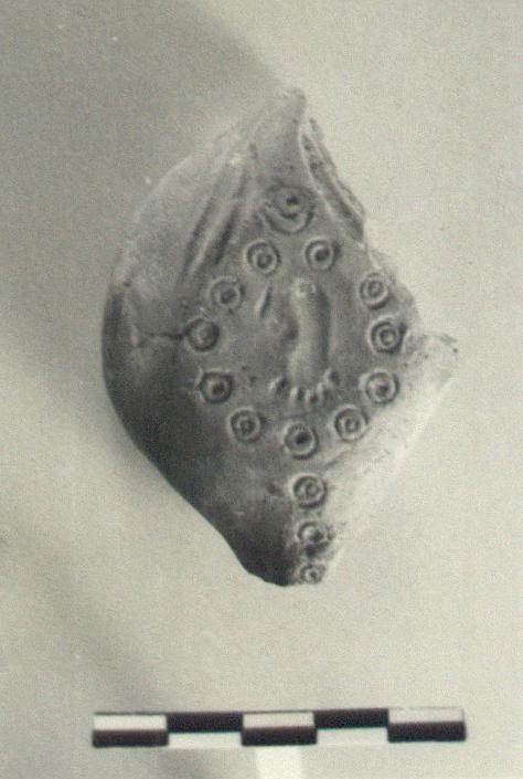| Description: | Bottom part only preserved. Almond-shaped reverse, with a ring of small stamped circles, within which is the stamp of a miniature left foot. One stamped circle at base of handle, and a row of them from the reverse along the underside of the neck, to the nozzle. Base of handle plain; grooves on either side. Thin red wash. Red clay. Type XXVIII of Corinth collection. | |