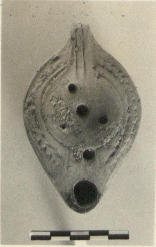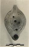 | Description: | Lamp with nearly vertical sides, and down sloping rim. Four holes on discus; one at base of nozzle. Herringbone on rim; plain discus; solid handle, double grooved above and below; almond-shaped reverse, outlined by two grooves, with small circles at handle and nozzle ends. Traces of signature inside (?). Unglazed. Pinkish-buff clay. Type XXVIII (late variety) of Corinth collection. | |