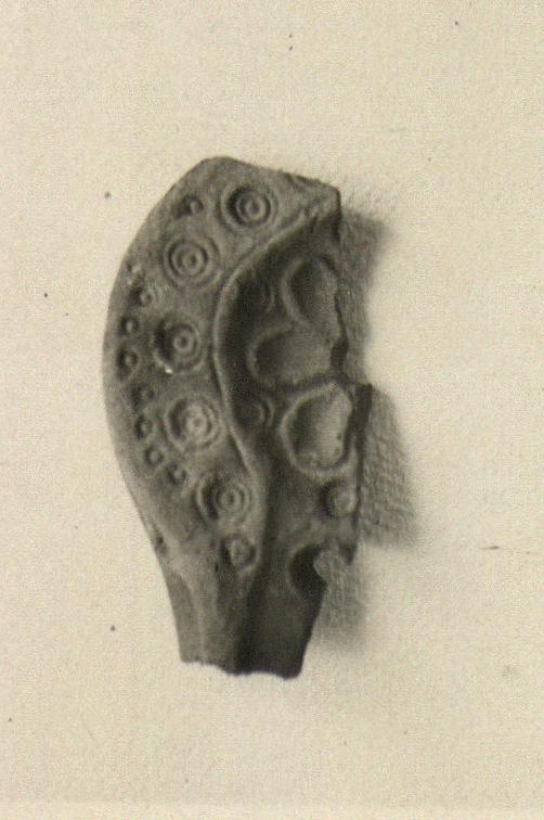 | Description: | Fragment of discus and rim; nozzle broken. On rim, large stamped concentric circles, with dots along outer edge. On discus, rosette; stamped circles between the tips of the petals. On nozzle, wide channel from discus with large hole on neck. Unglazed. Red clay; grayed by fire. Type XXVIII of Corinth collection. | |
