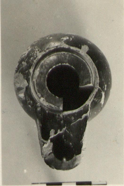 | Description: | Nozzle and knob chipped, and a piece of rim missing. Low base; deep unglazed groove around rim; no handle. Pierced lug on one side of body. Good black glaze. Attic clay. Type VII (glazed variety) of Corinth collection, type 25B of Agora collection. | |