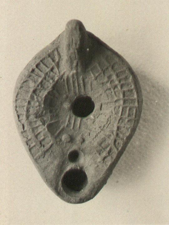 | Description: | Rim and discus, both covered with a crude impressed network, as if to give the impression of herringbone pattern on the former and rays on the latter; large hole, off center. Handle, solid, double grooved. Nozzle, plain. On reverse, double almond-shaped groove, with palm branch. Unglazed. Red clay. Type XXVIII of Corinth collection. | |