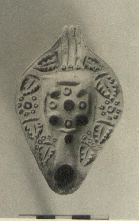 | Description: | Intact except for bit out of bottom and side. On rim, large leaves and dot-rosette flowers. Small stamped circles at base of handle on rim, and on rim between last two leaves on each side. Squarish discus with cross, each arm of which has a large stamped circle. Filling hole in center of cross, and two others in lower fields. Large air hole at base of channel between nozzle and discus. Solid handle, with two grooves above and below. Large almond-shaped reverse, enclosed by double grooved lines, with stamped circles at point and base of handle. Within, palm branch, the signature. Unglazed. Light red clay. Type XXVIII (late variety, with vertical walls) of Corinth collection. <graphic> | |