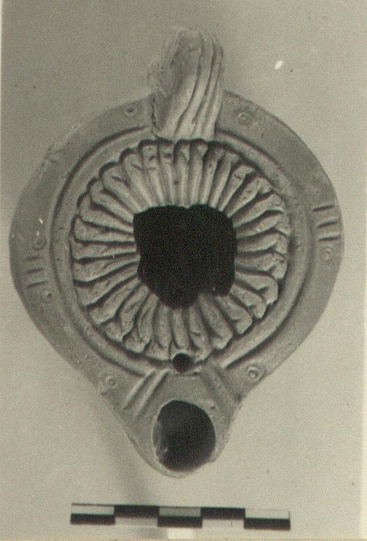 Plain rim with panels, grooved. On either side of panels, nozzle and handle, a stamped circle. Many-petalled rosette on discus, edges of petals crimped over. Solid handle with three grooves above and two below. Stamped semi-circles at base of handle. Circular reverse with double concentric grooves, enclosing a signature.