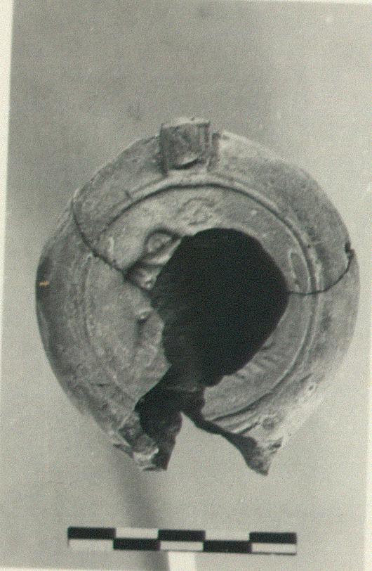 | Description: | Handle missing, nozzle, and much of discus. Portions of a gladiator in relief remain on the discus. Plain down sloping rim. Underneath, a single circular groove, enclosing the signathre "Λ", incised in the unbaked clay. Type XXV of Corinth collection. | |