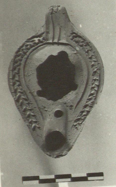 | Description: | Discus missing. A flat-bottomed boat-shaped lamp, with almost vertical sides. Unpierced handle, double-grooved above and below. Broad channel from discus to nozzle. Herringbone rim. Palm leaf, between two letters, on reverse, which is outlined by a double groove. Two stamped circles at base of handle; one at base of nozzle. Unglazed. Buff clay. Type XXVIII of Corinth collection. <graphic> | |