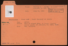 | Description: | Small fragment of discus. On discus, head of winged Eros, to right, blowing double pipes. Unglazed. Red clay. Type XXVIII of Corinth collection. Cf. Corinth IV, ii, no. 1128, pl. XXIX. | |
