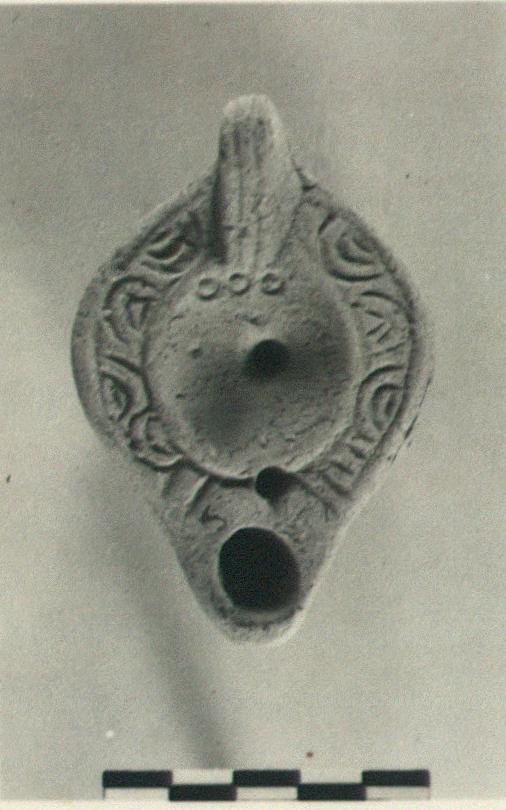 | Description: | Intact. Wavy lines on rim, discus plain with three impressed circles at base of handle. Handle, solid, double grooved above and below. Reverse almond-shaped; two grooves enclosing palm branch; two impressed circles at base and one at tip. Unglazed. Bright red clay. Type XXVIII of Corinth collection. | |