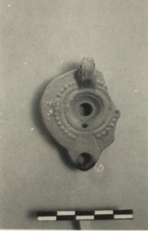 | Description: | Part of the right side missing. Miniature lamp. Dots on rim; nozzle raised slightly above rim. Plain discus, sharply concave. Pierced handle, double grooved above, plain below. On the reverse, a leaf, raised, between two circular ridges. Unglazed; traces of burning at nozzle. Pale pinkish-buff clay. Type XXVII of Corinth collection. | |