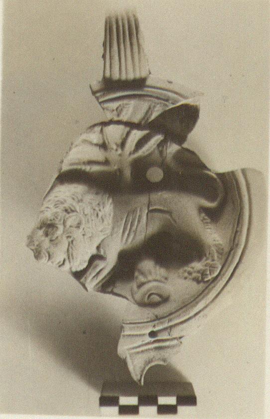 | Description: | Much of the discus and rim, with the handle, and a bit of the top of the nozzle, preserved. On the discus a lion, rampant, left, in front of a palm tree. Double-pierced handle, five grooves above, three below. Plain rim. Unglazed. Light red clay. Type XXVII of Corinth collection. | |