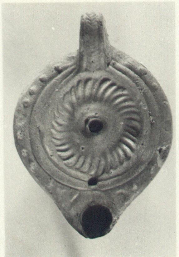 | Description: | Intact. On rim, stamped circles and raised dots. Whirling rosette, with very small petals on discus. Solid handle, herringbone pattern on front. Circular reverse with double concentric grooves. Purplish glaze. Red clay. Type XXVIII of Corinth collection. | |