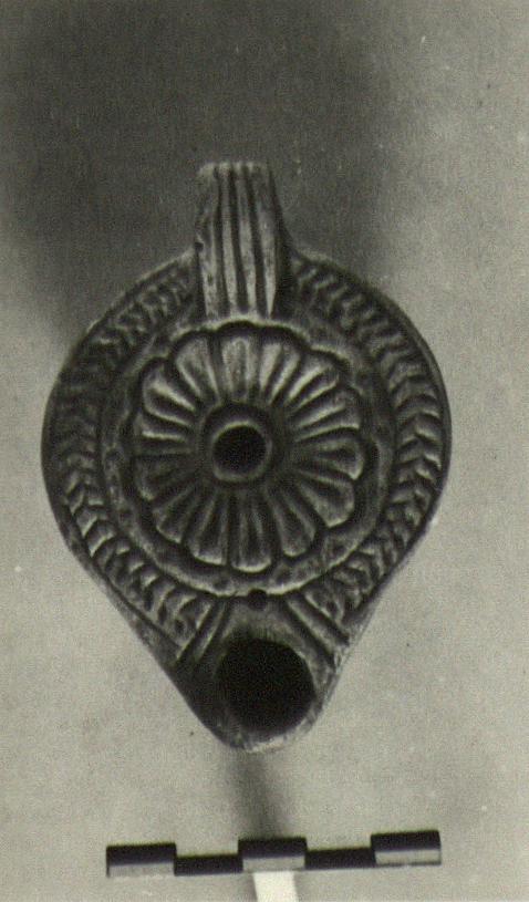 | Description: | Intact. Handle unpierced, triple grooved above, double below. Rosette on discus; herringbone rim. Ob bottom two concentric grooves enclosing signature "KY". Type XXVIII of Corinth collection. | |