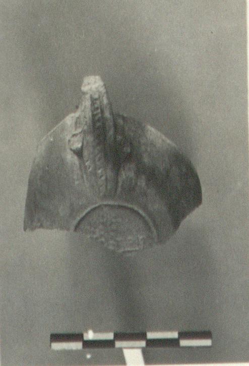| Description: | Handle and adjacent parts of body preserved. Rim plain. Handle partly pierced, grooved above and below; hatching between grooves below. Signanture on reverse: palm branch with "E". Unglazed. Grayish clay. Type XXVIII of Corinth collection. | |