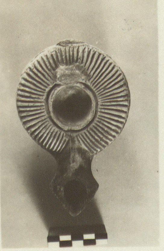 | Description: | Handle missing; otherwise complete. Low base; triangular nozzle; upper body ribbed. Letters incised beneath. Poor brownish glaze; mostly peeled off. Type XVIII of Corinth collection, type 52H of Agora collection. | |