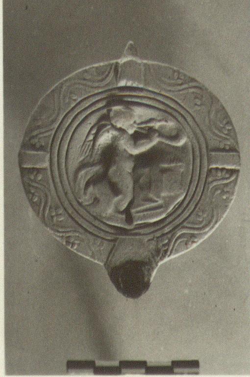 | Description: | Intact save for upper part of pierced grooved handle, broken off. On discus, Eros, right, playing double flute in front of an altar on which a fire burns. On rim, tendrils, with plain panels. Underneath, incised in the unbaked clay. Unglazed. Fine buff clay. Type XXVII of Corinth collection. <graphic> | |