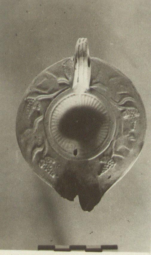 | Description: | Intact save for tip of nozzle. Grapevine pattern on rim; fine rays on discus. Handle pierced, double grooved above and below. Single circular groove on reverse, enclosing signature, inscribed in the unbaked clay. Unglazed. Thin fabric of fine buff clay. Type XXVII of Corinth collection. <graphic> | |