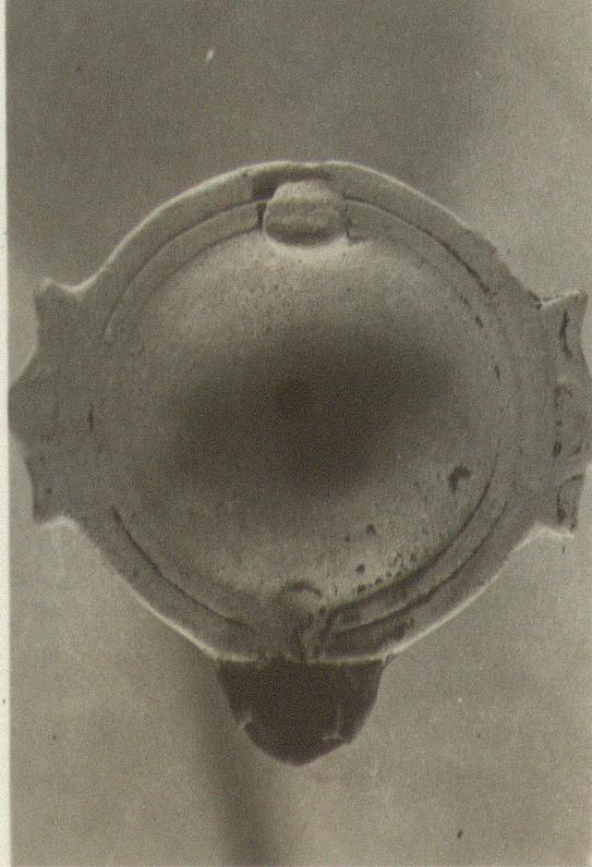 | Description: | Vertical handle broken off, and nozzle chipped. Two lug handles at sides. Large plain discus; narrow grooved rim. Beneath, "alpha", written in the mould, enclosed within a single groove. Red to black glaze almost entirely peeled off. Buff clay. Type XXIV of Corinth collection. | |