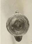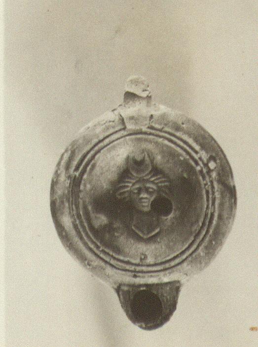 | Description: | Handle broken off. On discus, head of woman facing, with crescent moon on top. Selene (?). Underneath, "alpha", made in the mould; enclosed within a single groove. Poor reddish-brown glaze. Type XXV of Corinth collection. | |