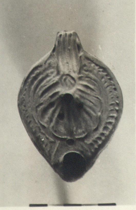 | Description: | Intact. Herringbone pattern on rim; shell on discus. Pierced handle with three grooves above and two below. Circular reverse with double grooves enclosing letter: "K". Red clay nad wash (?). Type XXVIII of Corinth collection. | |