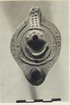 | Description: | Intact. Panels on rim with herringbone pattern; stamped circles on either side of these, and of handle and nozzle. Two stamped circles at base of nozzle, and five more at top of discus, which also has a crescent. Solid handle with herringbone pattern on front; two grooves behind. Circular reverse with two concentric circles enclosing a stamped one. Unglazed. Light red clay. Type XXVIII of Corinth collection. | |