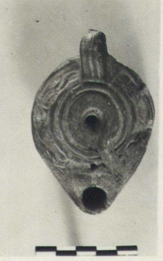 Wavy lines on rim; plain discus; solid handle with triple grooves above and double below. Circular reverse with double concentric grooves enclosing palm branch (?).