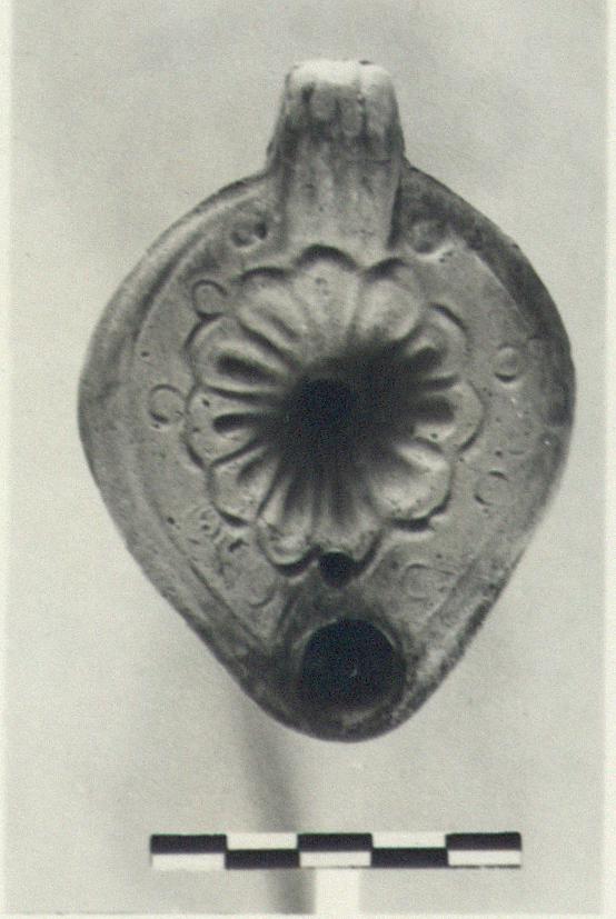 | Description: | Intact. Rim has groove around edge, within which large stamped circles. Rosette on discus. Solid handle triply grooved before and behind. Circular reverse with two concentric grooves enclosing stamped circle. Red clay and wash, burned. Type XXVIII of Corinth collection. | |