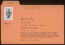 | Description: | Intact. Plain rim with herringbone panels, and stamped circles. Plain discus. Solid handle; triply grooved before and doubly behind. Almond-shaped reverse with double grooves enclosing six stamped circles arranged in the shape of a cross. Light red clay and wash. Type XXVIII of Corinth collection. | |