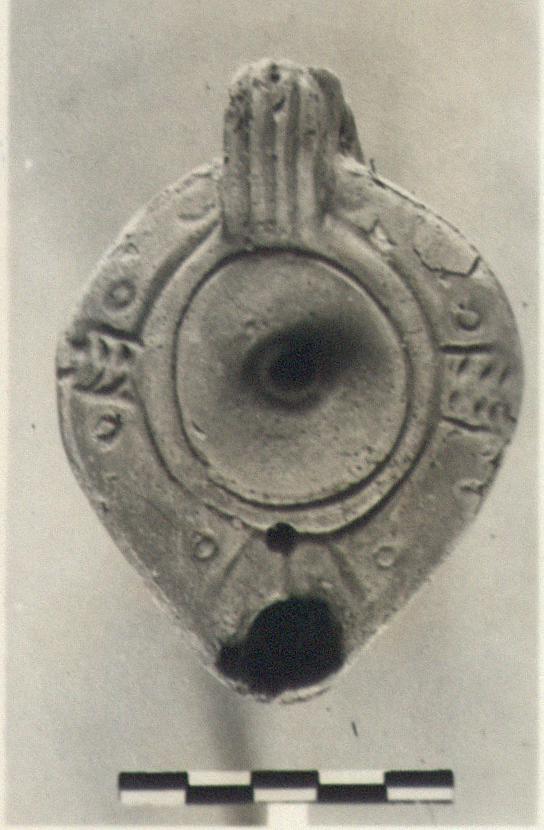 | Description: | Intact. Plain rim with herringbone panels, and stamped circles. Plain discus. Solid handle; triply grooved before and doubly behind. Almond-shaped reverse with double grooves enclosing six stamped circles arranged in the shape of a cross. Light red clay and wash. Type XXVIII of Corinth collection. | |